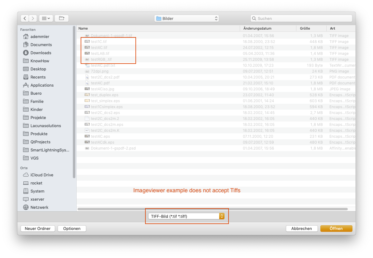In the Image Viewer example, do File->Open, and select "PNG image (*.png)" category. Observe that the png files are still unselectable, instead the files of the preceding category (jpegs) are selectable. Similarly, in order to select a tiff file, one must choose the following (ICO) category.