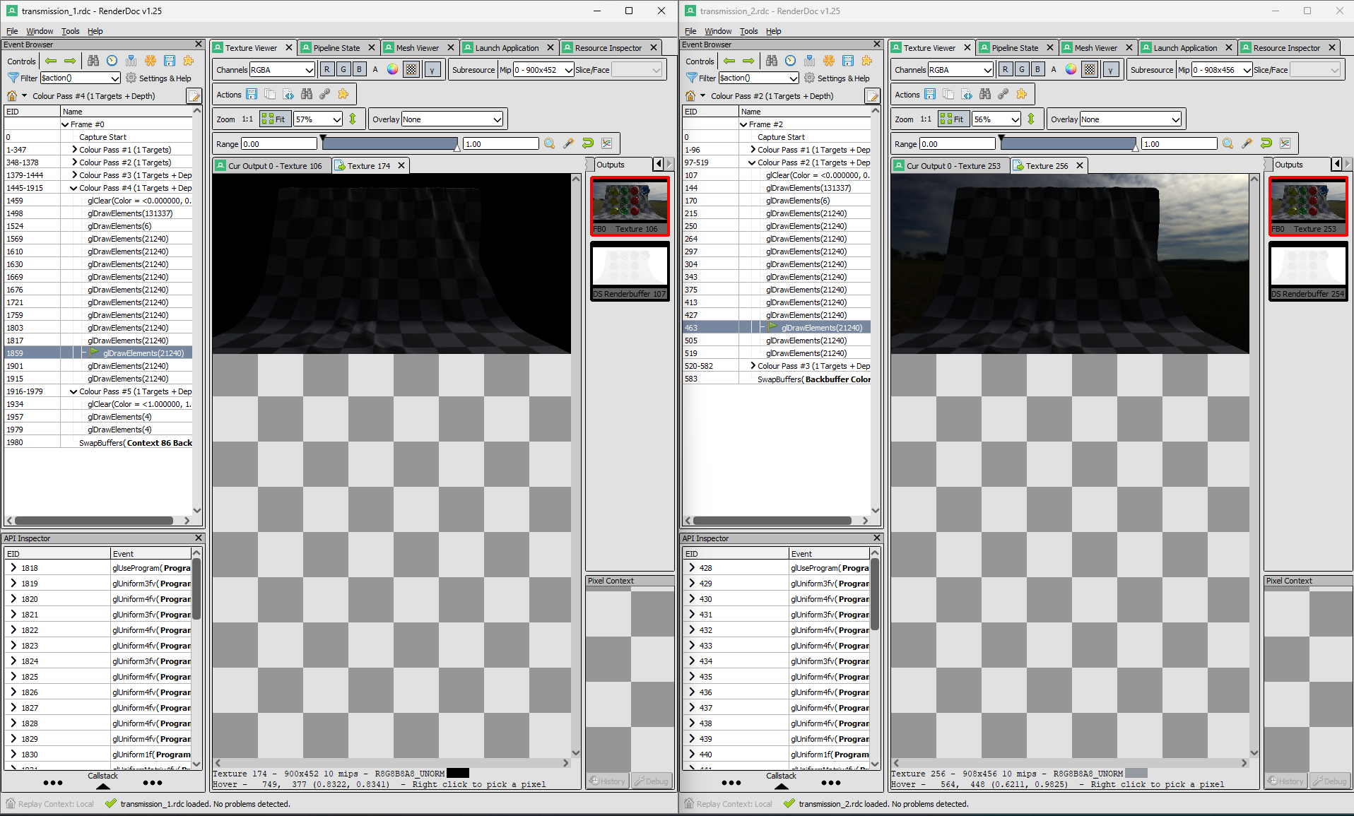A capture shows why this is: the contents of the screen texture is simply different. On the left, the capture is from (hopefully) the first frame. On the right, the second capture is after resizing the window. Shown there is the screen texture. Note how it does not have the light probe texture used as the skybox on the left.