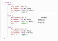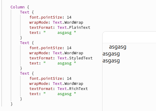 textFormat: Text.PlainText // <--- if this is changed to RichText, the space in the " asgasg " is removed in the rendered text.