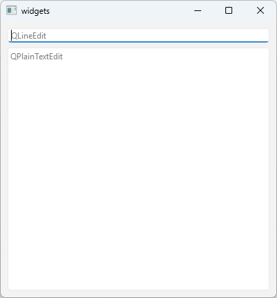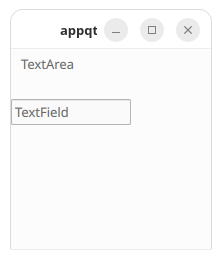 import QtQuick import QtQuick.Controls ApplicationWindow { width: 200 height: 200 visible: true Column { spacing: 20 TextArea { placeholderText: "TextArea" } TextField { placeholderText: "TextField" } } }