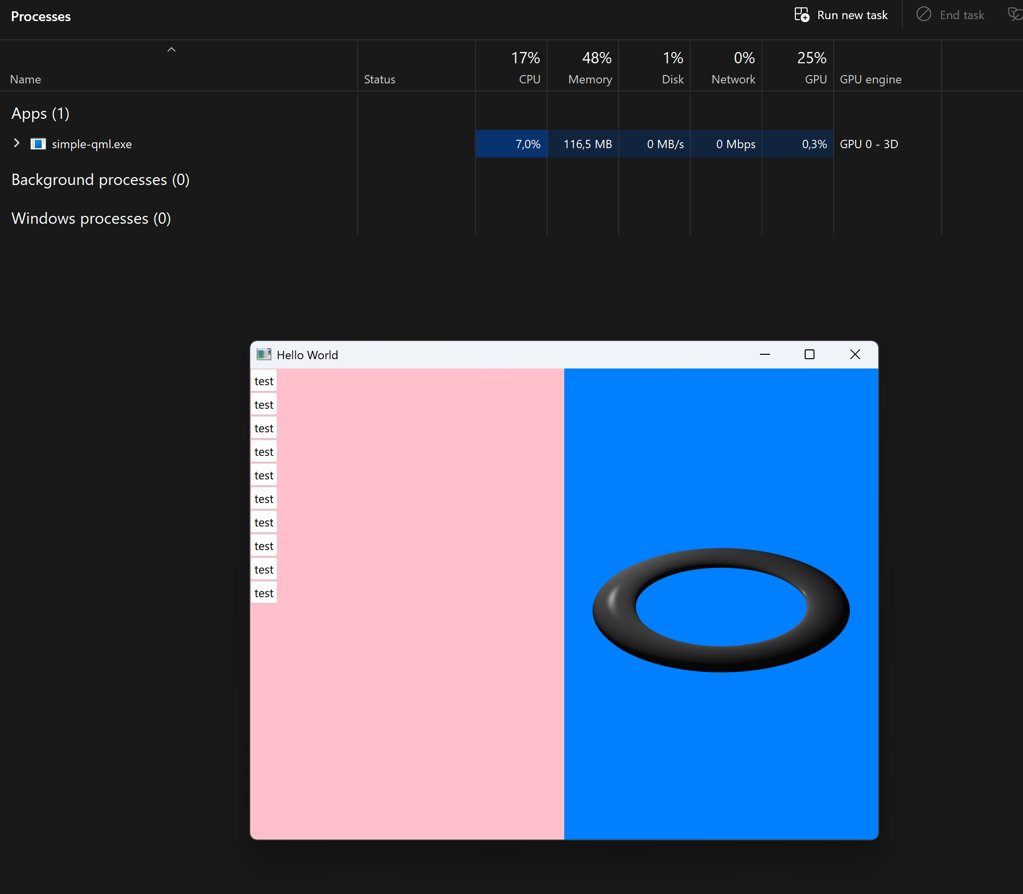 You'll find attached a demonstrator based on the simple-qml Qt 3D example in which I forced the usage of OpenGL and added some Qt Quick elements.
