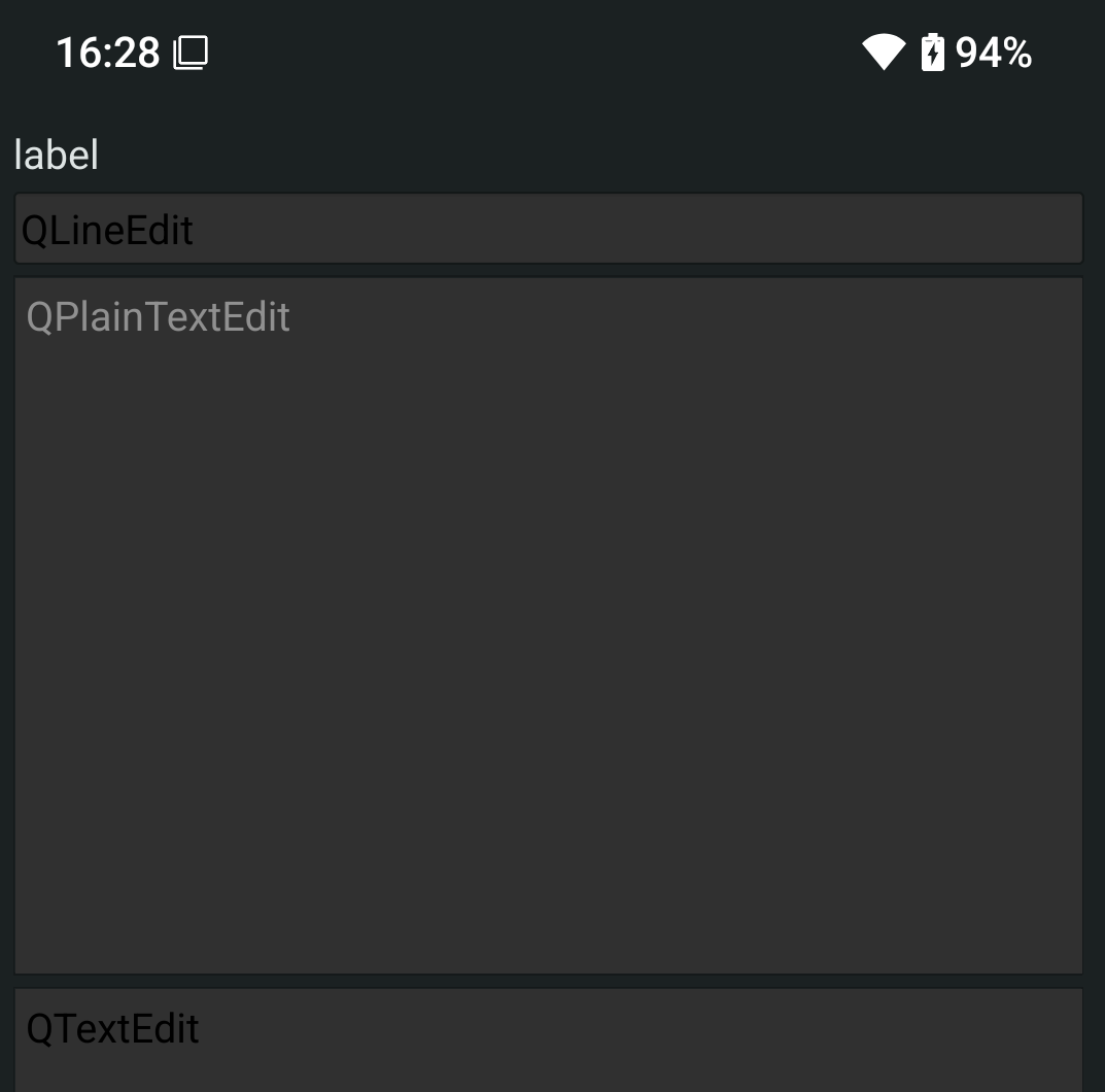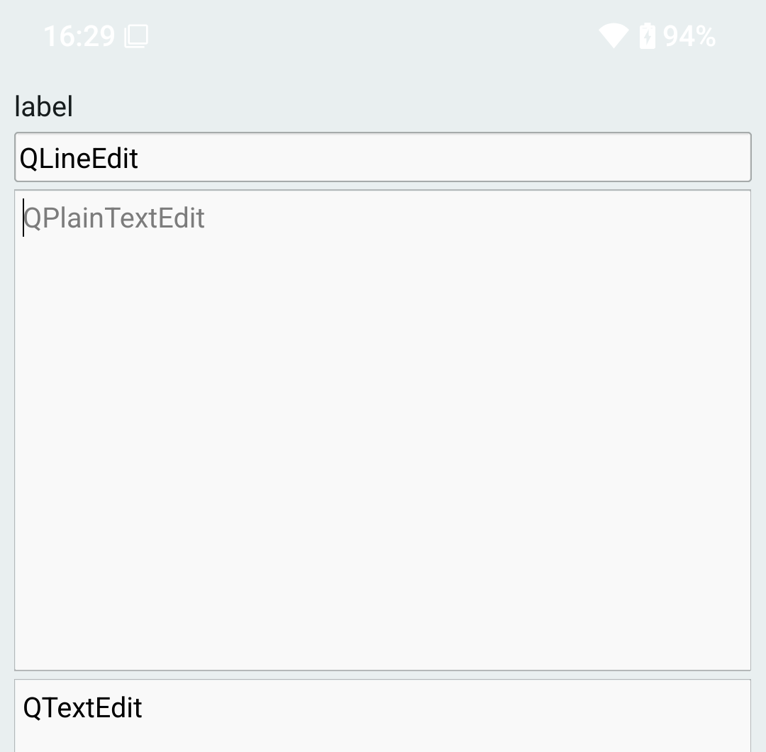 int main(int argc, char* argv[]) { QApplication::setAttribute(Qt::AA_EnableHighDpiScaling); QApplication a{argc, argv}; QWidget w; w.show(); auto le = new QLineEdit{&w}; le->setPlaceholderText("QLineEdit"); auto ple = new QPlainTextEdit{&w}; ple->setPlaceholderText("QPlainTextEdit"); auto te = new QTextEdit{&w}; te->setPlaceholderText("QTextEdit"); QVBoxLayout l{&w}; l.addWidget(new QLabel{"label", &w}); l.addWidget(le); l.addWidget(ple); l.addWidget(te); l.addStretch(); return a.exec(); }