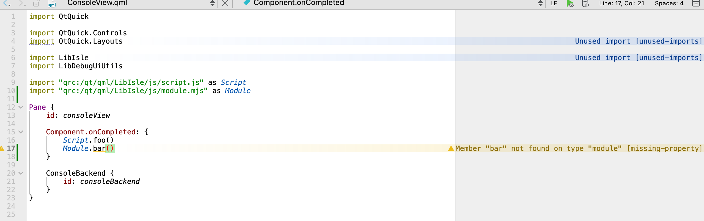 Open isle/LibDebugUiUtils/qml/ConsoleView.qml from the attached project in Creator to reproduce the issue.
