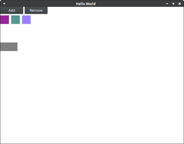 import QtQuick import QtQuick.Controls import QtQuick.Layouts Window { id: root width: 640 height: 480 visible: true title: qsTr("Hello World") property int numRectangles: 0 ColumnLayout { RowLayout { Button { text: "Add" onClicked: ++root.numRectangles } Button { text: "Remove" onClicked: root.numRectangles = Math.max(0, --root.numRectangles) } } FlexboxLayout { wrap: FlexboxLayout.Wrap direction: FlexboxLayout.Row justifyContent: FlexboxLayout.JustifyStart rowGap: 8 columnGap: 8 Repeater { model: root.numRectangles Rectangle { width: 30 height: 30 color: Qt.rgba(Math.random(),Math.random(),Math.random(),1) } } } Rectangle { width: 60 height: 30 color: "gray" } } }