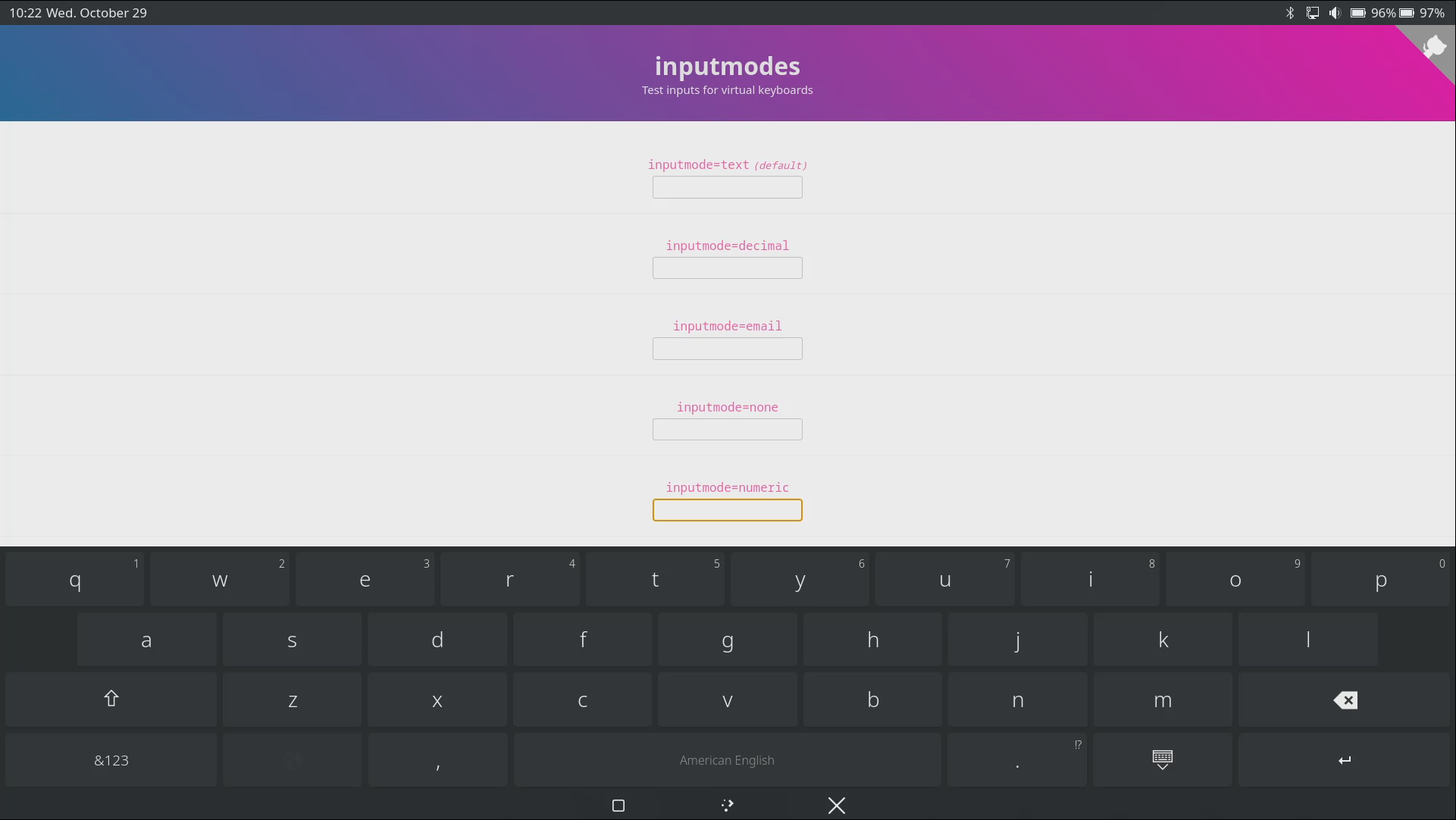In the attached screenshot, I start a small test application on https://inputmodes.com/ and select a "numeric" input field. QtVirtualKeyboard shows the standard layout even though the field inputmode is set to: