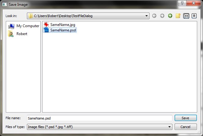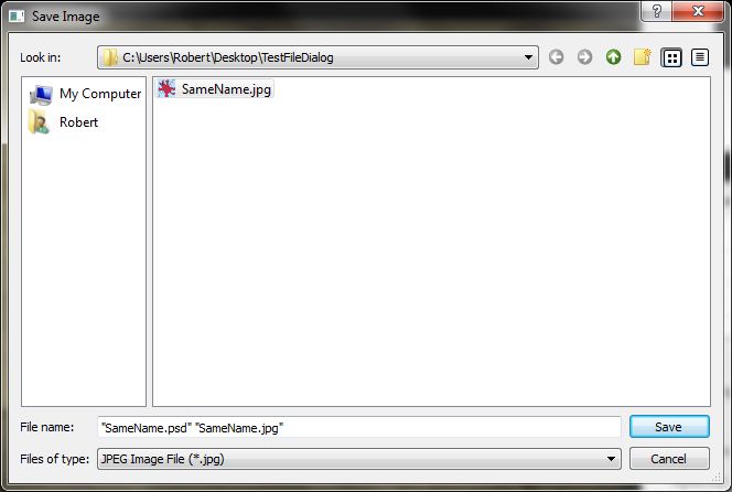 There is a bug in QFileDialog when you use the save dialog and have multiple filters setup and change the filter, two files can be added in the File Name line edit.