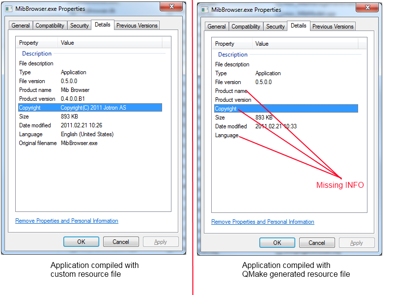 1. Because by default QMake generates resource files without this additional information, text of some fields in file details dialog is not visible under Windows Vista or Windows 7 (see image Screenshots.png)