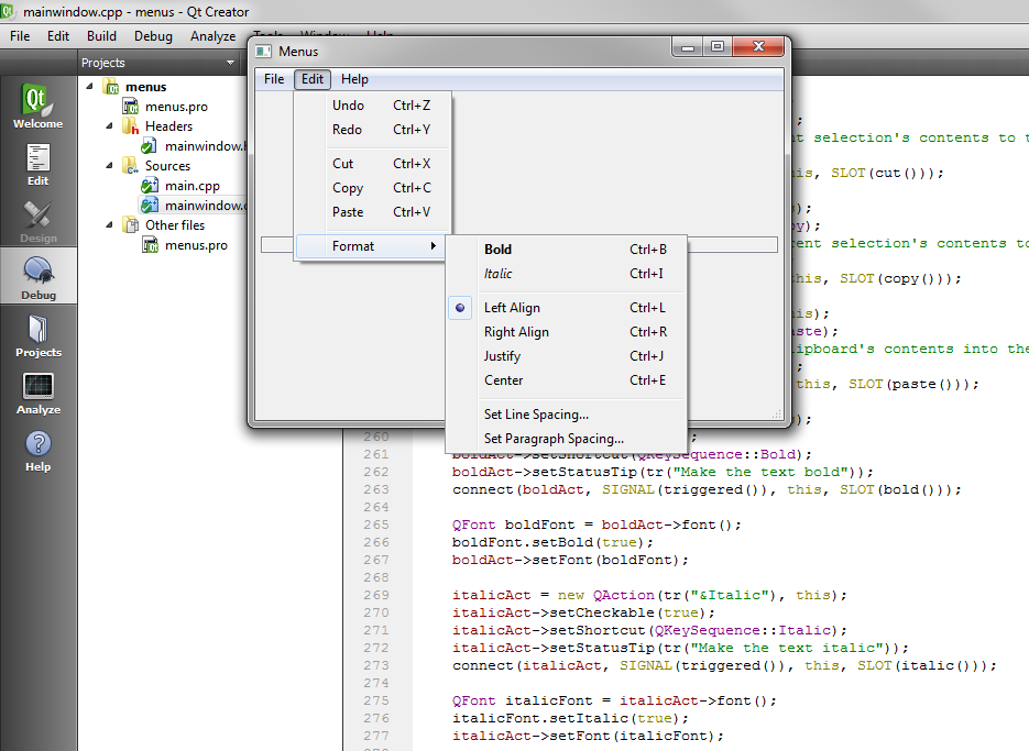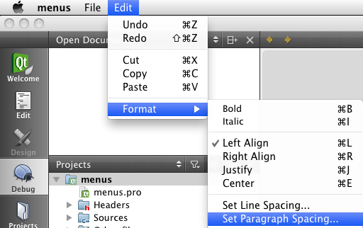 Build and run the Qt examples/mainwindows/menus/menus.pro project on Windows and on Mac OS X (Cocoa build of Qt).