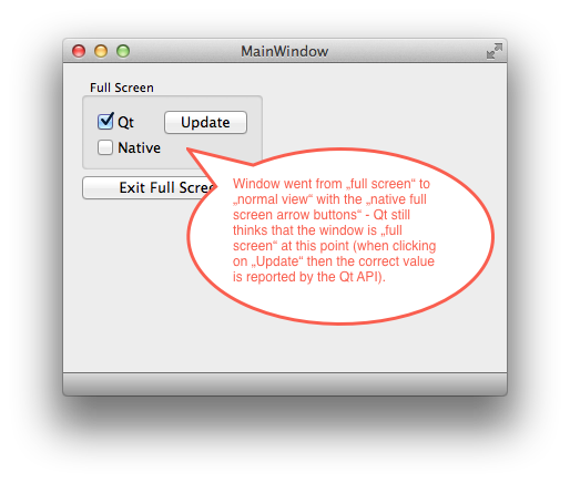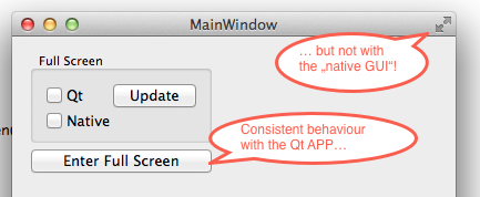 - Bad: Only the "native Cocoa" API reports that the widget is now "full screen" and hence the "Qt" checkbox remains unchecked and hence the button text remains "Enter Full Screen"