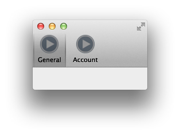 #include <QtWidgets> int main(int argc, char **argv) { QApplication app(argc, argv); QMainWindow w; w.setUnifiedTitleAndToolBarOnMac(true); QIcon icon("/Applications//iBooks.app/Contents/PlugIns/iBAReaderKit.bundle/Contents/Resources/play-small-64-P.png"); QToolBar *toolbar = w.addToolBar("maintoolbar"); toolbar->setMovable(false); toolbar->setIconSize(QSize(32, 32)); toolbar->setToolButtonStyle(Qt::ToolButtonTextUnderIcon); QAction *general = toolbar->addAction(icon, "General"); QAction *account = toolbar->addAction(icon, "Account"); general->setCheckable(true); general->setChecked(true); w.show(); return app.exec(); }