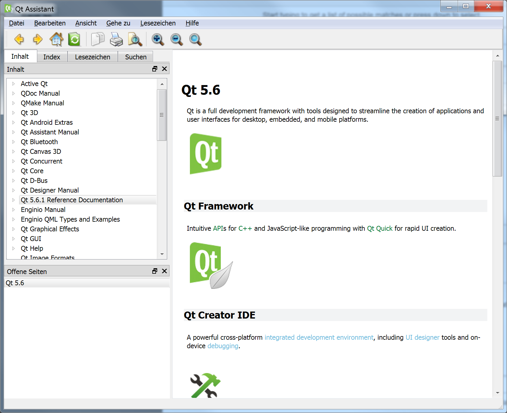 Open "Qt 5.6.1 Reference Documentation" in Qt Assistant. It still uses the old icons: It should use Qt's new icons.