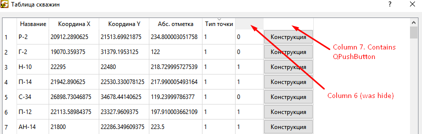 I create QTableview and uses QSqlTableModel. She contains 7 columns. Columns 0 and 6 is hide.