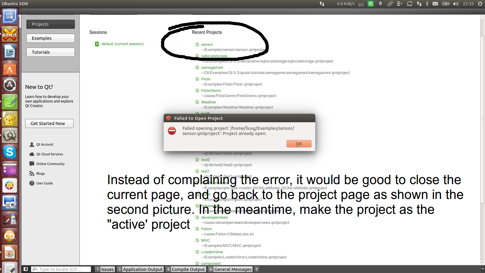 If an project is already open, qt creator complains that it fails to