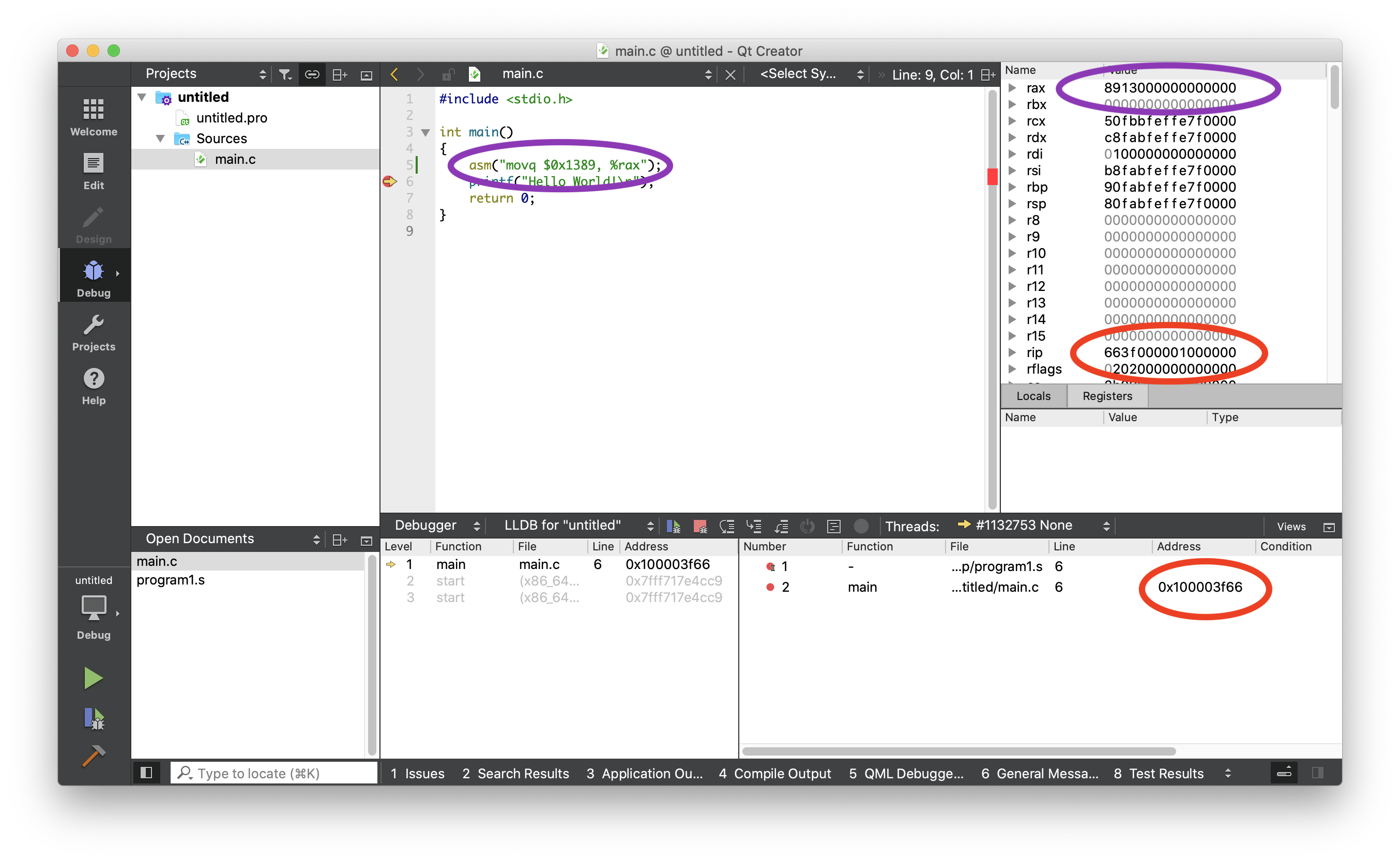 #include <stdio.h> int main() { asm("movq $0x1389, %rax"); printf("Hello World!\n"); return 0; }