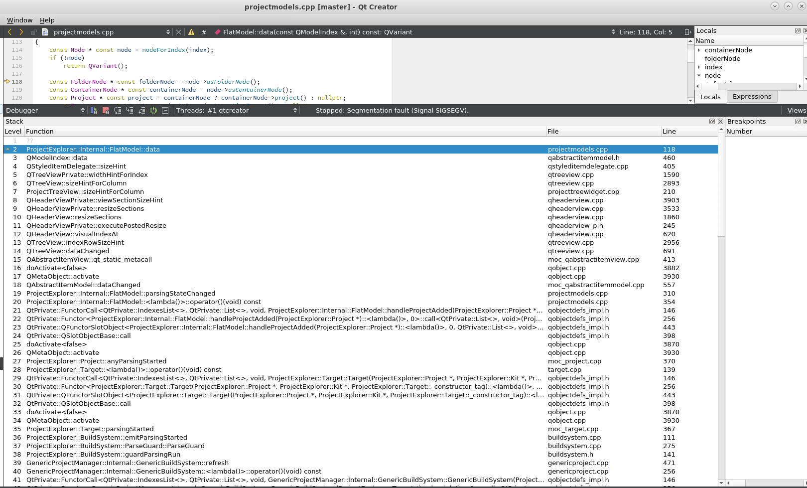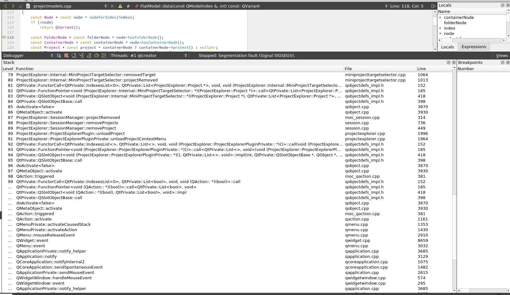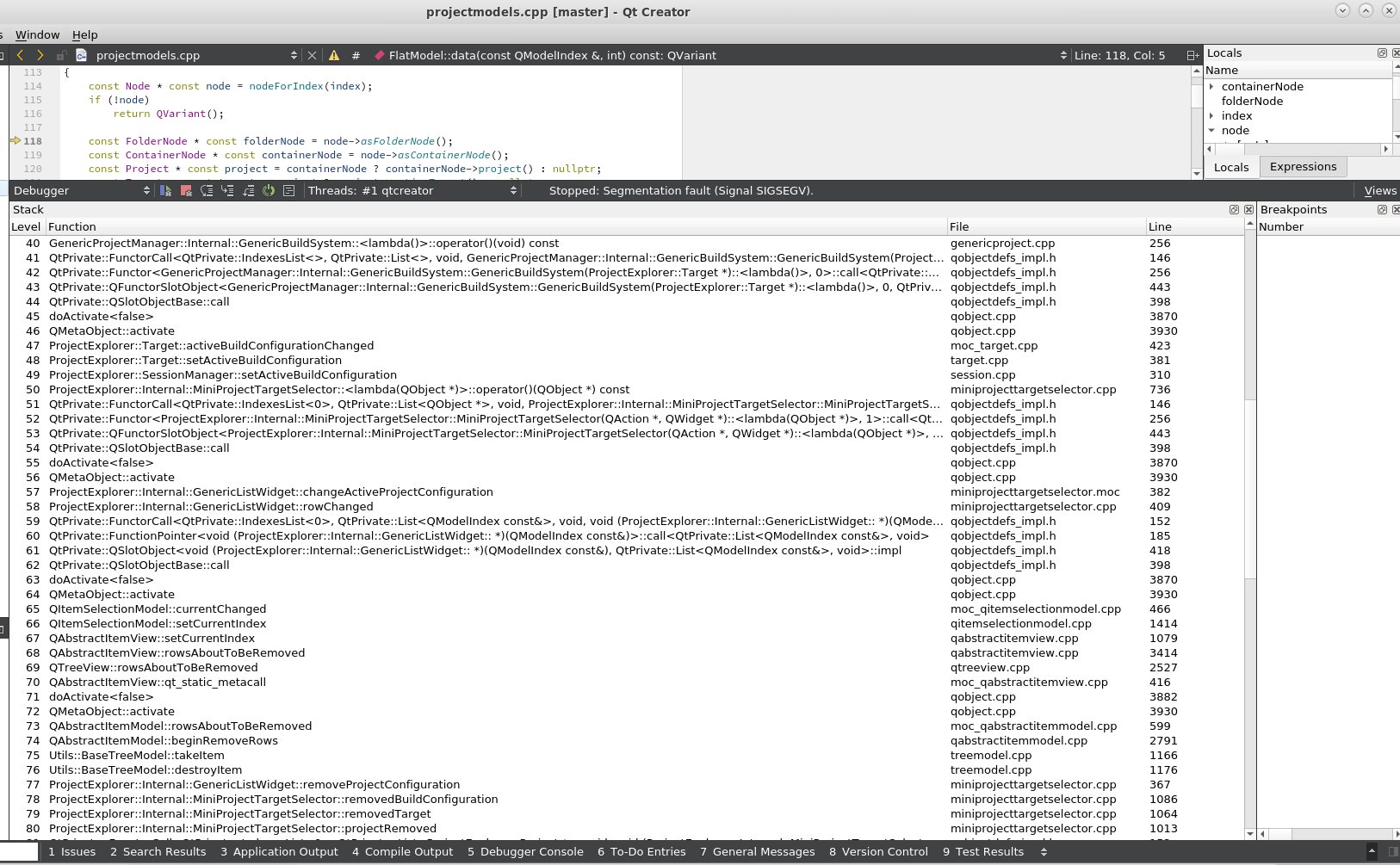 I was able to run QtC in debug mode, and I was able to capture stack trace (see pictures). Not sure what branch exactly was active when stack trace was collected.