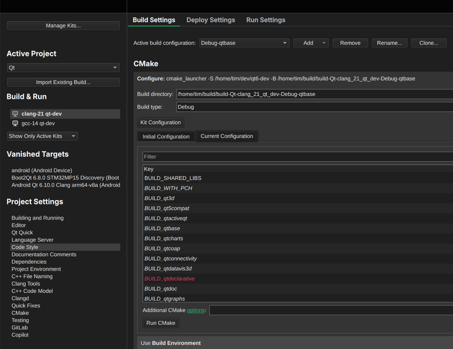 the last selected "kit" and the last selected "project setting" are both highlighted. in this screenshot, both the kit "clang-21" and the setting "code style" are highlighted.