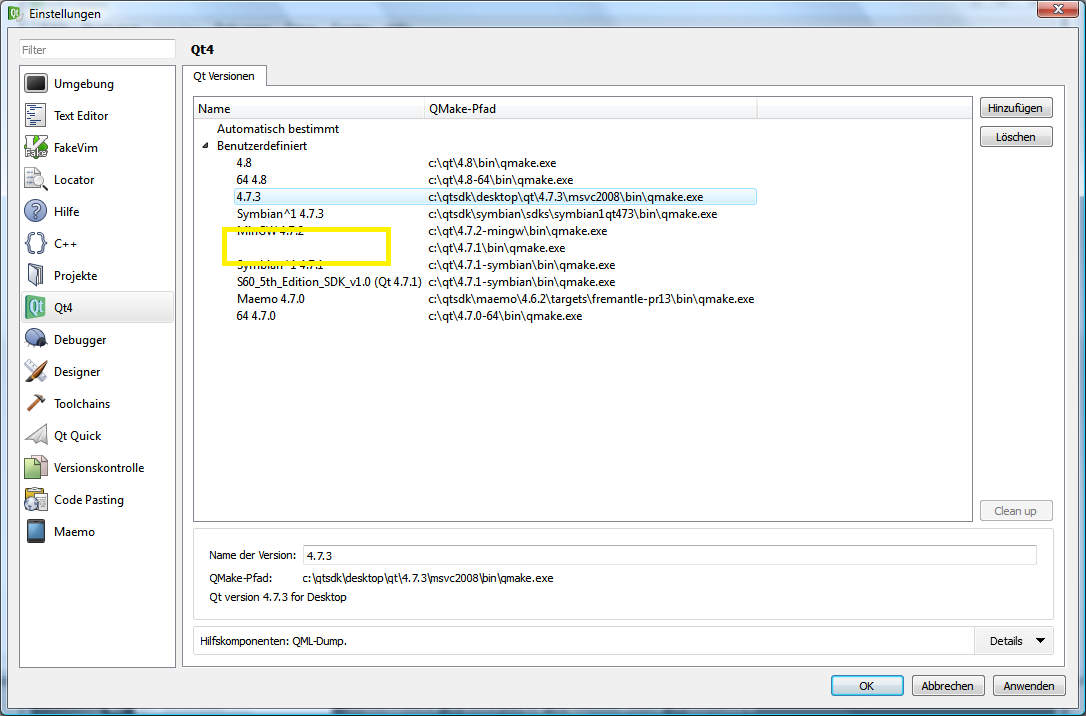 In the options dialog one can set up a Qt version with an empty name. This is not marked as an invalid version until one closes and reopens the dialog.