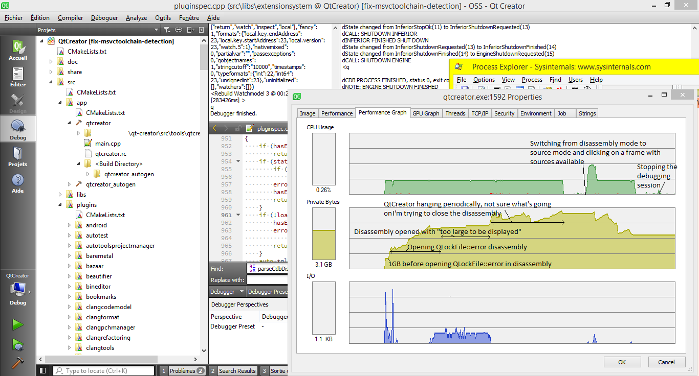 The debugger log view is limited to 100,000 lines. The problem is that the number of characters per line can easily exceed 1000 which would end up using 100,000 * 1000 * 2 = 200MB of heap.