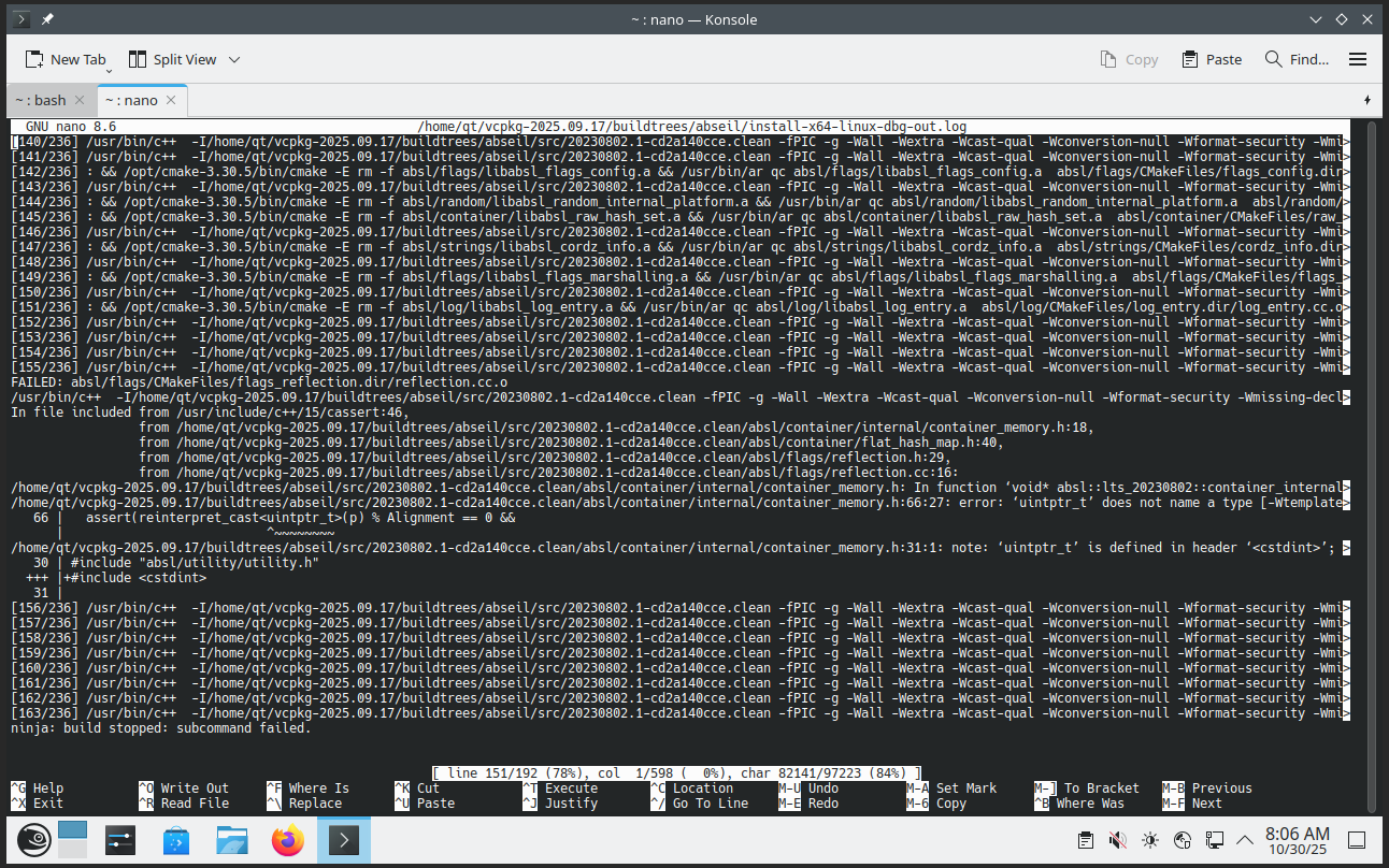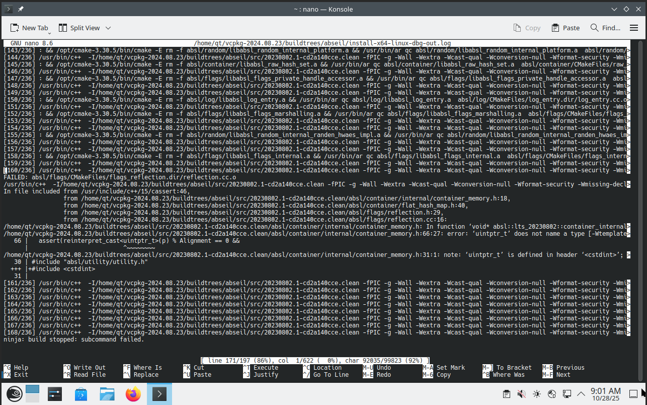 And from /home/qt/vcpkg-2024.08.23/buildtrees/abseil/install-x64-linux-dbg-out.log: