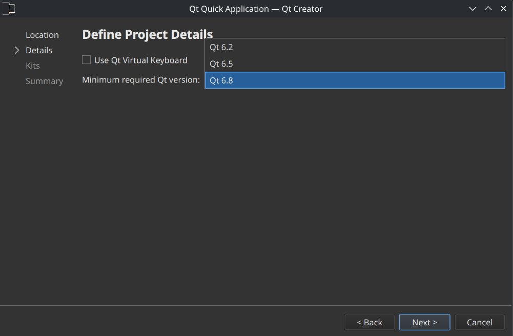 When create File - New Qt Project the pop-up "Create new Qt project" opens. There are menu options where one of them is a drop-down menu of Minimum Qt version. That one shows only one option 6.8. I have multiple Qt versions installed, including different 6.8 versions like 6.8.3 & 6.8.4 and 6.9 and 6.10. If the minimum required version is 6.8, why the drop down menu does not allow me to pick anything never than that? And why 6.8 as should it be 6.8.0?
