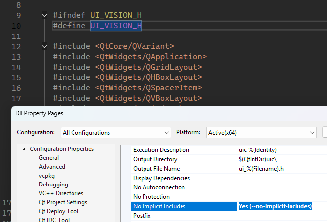 I have set "NoImplicitIncludes" to yes, but it continues creating the auto generated file from uic appending the includes: